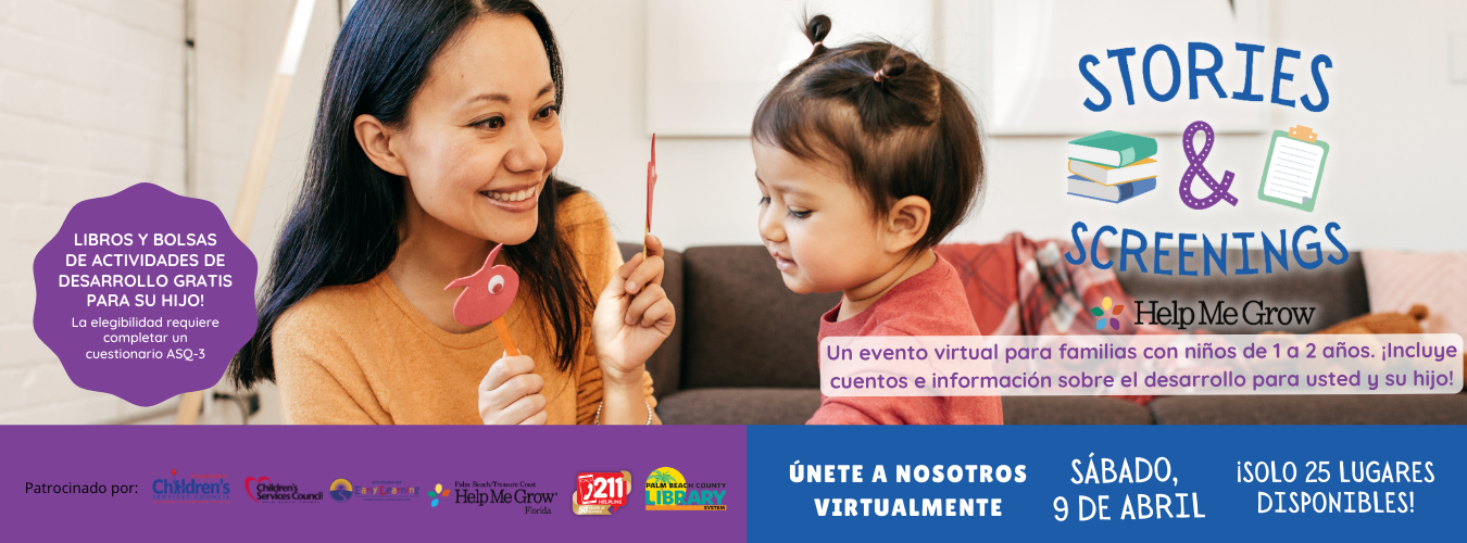 ¡Únase a Help Me Grow - 211 Palm Beach Treasure Coast en asociación con las bibliotecas publicas de Palm Beach County (Hagen Ranch Road Branch), para este evento virtual gratuito! El evento de “Cuentos y Evaluaciones” (Stories and Screenings) es un evento virtual para familias con niños de 1 a 2 años.