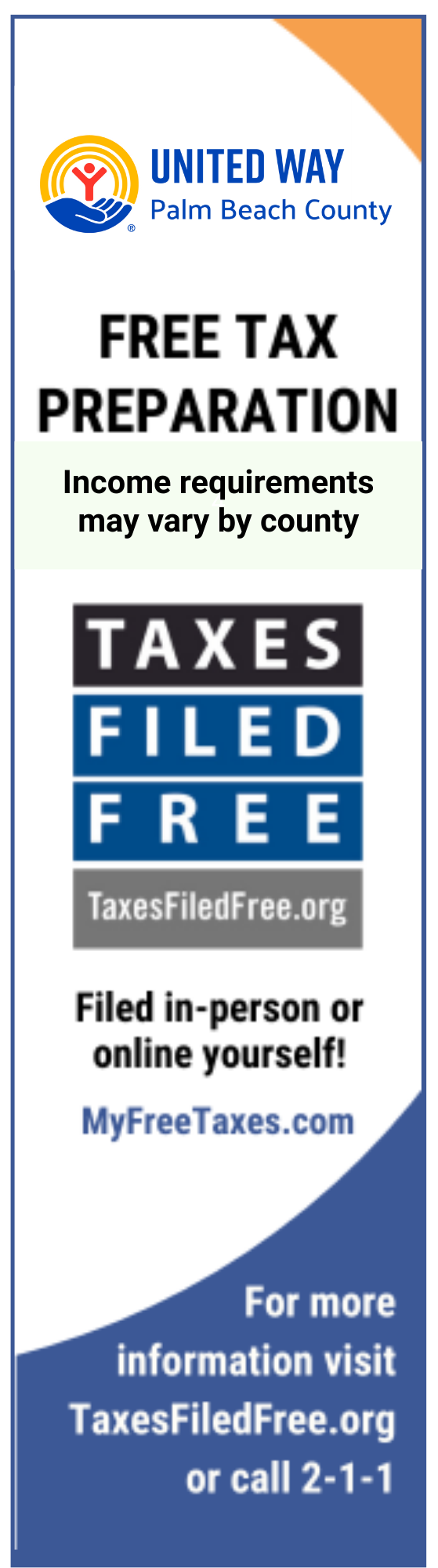 The Taxes Filed Free Initiative provides free, confidential, and secure preparation and e-filing of tax returns to qualified taxpayers. To qualify, the taxpayer’s income must have been $78,000 or less in Palm Beach County and $67,000 or less in the Treasure Coast Counties in 2025.